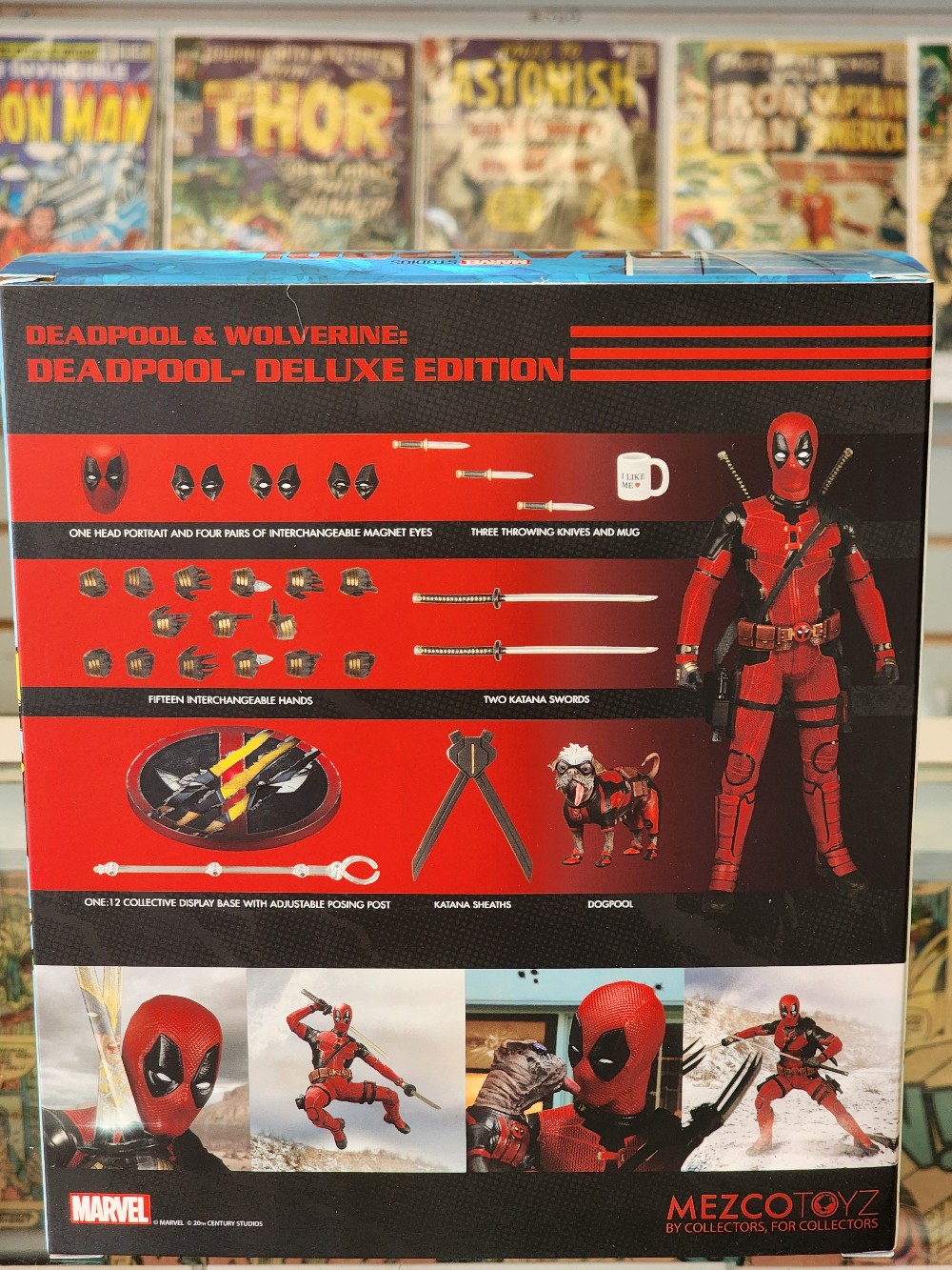 From Marvel Studio’s Deadpool & Wolverine, the One:12 Collective Deadpool is outfitted in his signature red suit, featuring four pairs of eye pieces that resemble various expressions and are interchangeable by magnet. The "Merc with a Mouth'' comes equipped with knives, katanas, and other handheld weapons, all of which can be stored in the multiple holsters and sheaths on his suit.