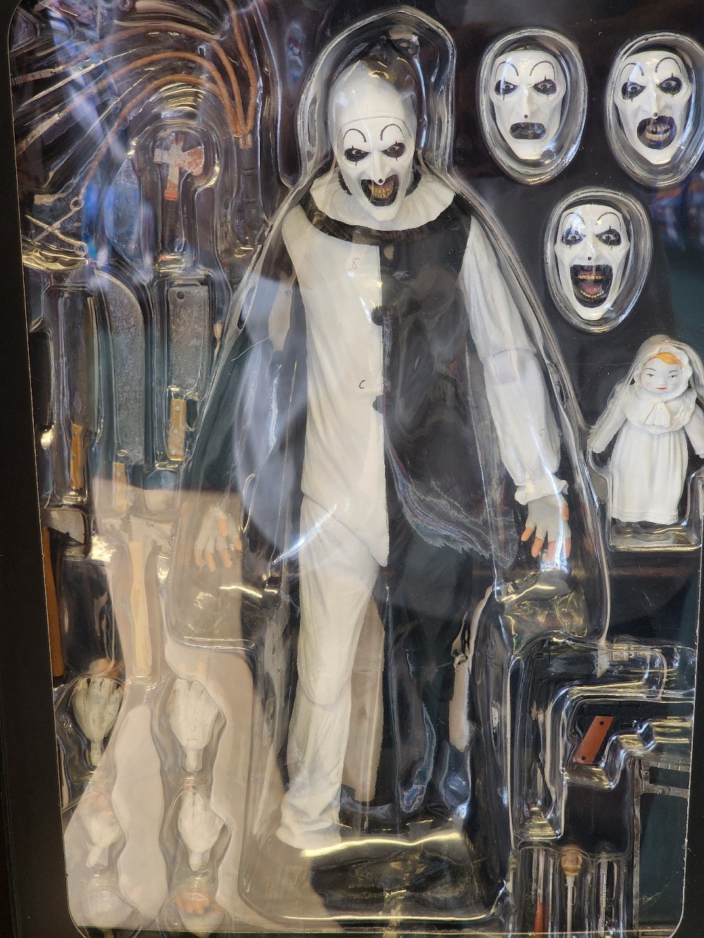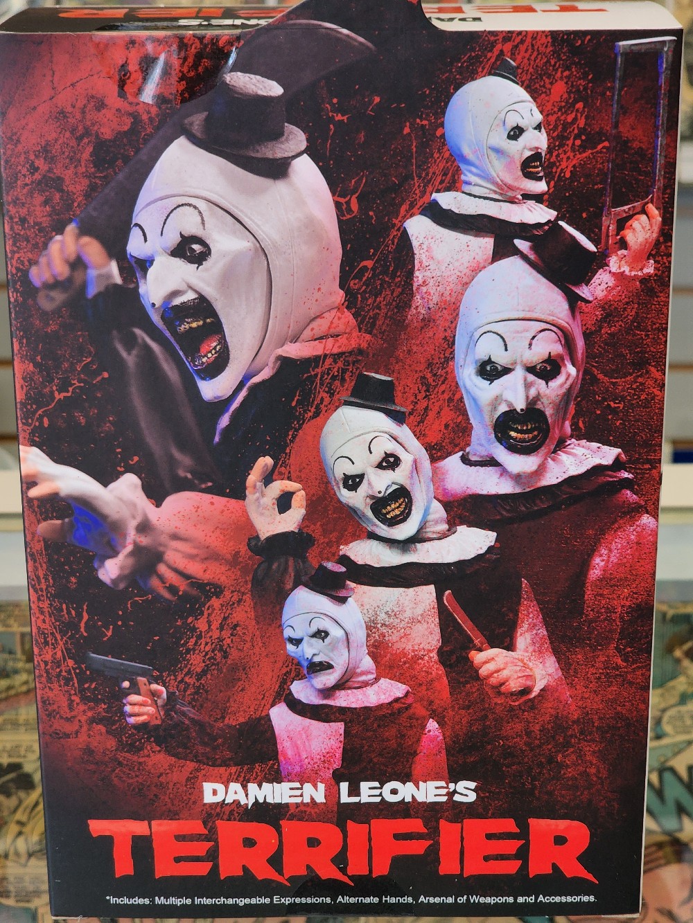 Plus, an unsettling arsenal of weapons and accessories! Comes in collector-friendly window box packaging with opening front flap—perfect for your horror display.